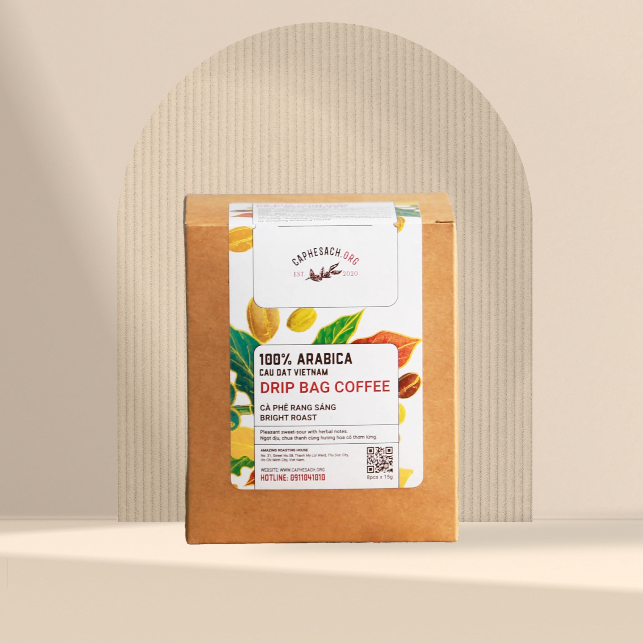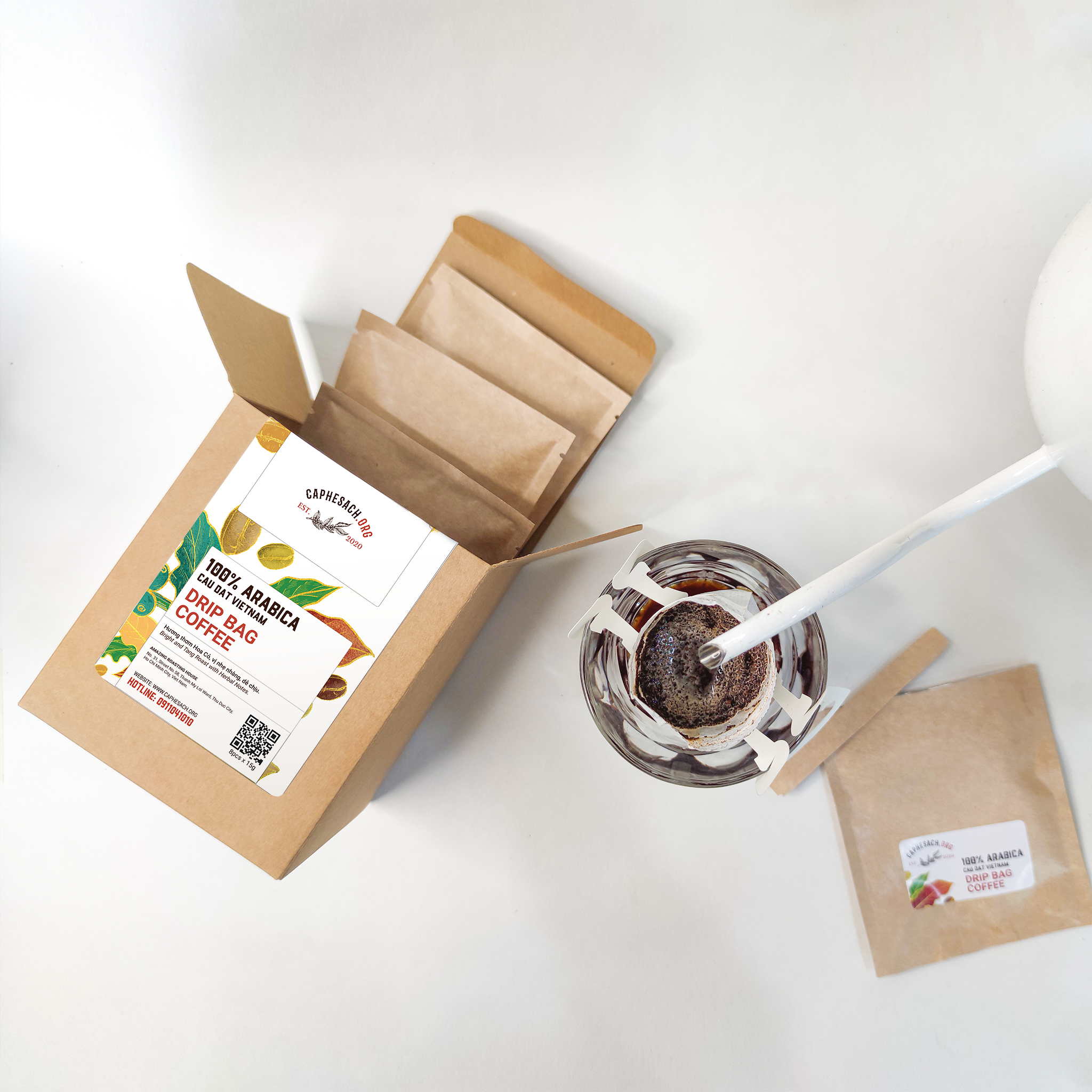 Cà phê Túi Lọc Drip Bag 100% Arabica Rang Sáng - Hộp 8 gói x 15G - Ngọt dịu, thơm lừng hương Hoa Cỏ.